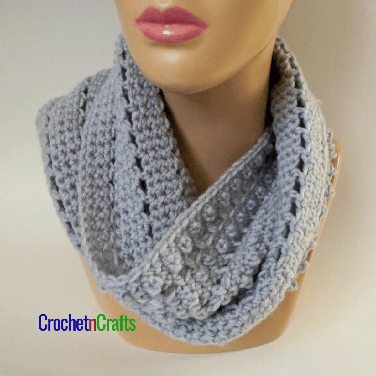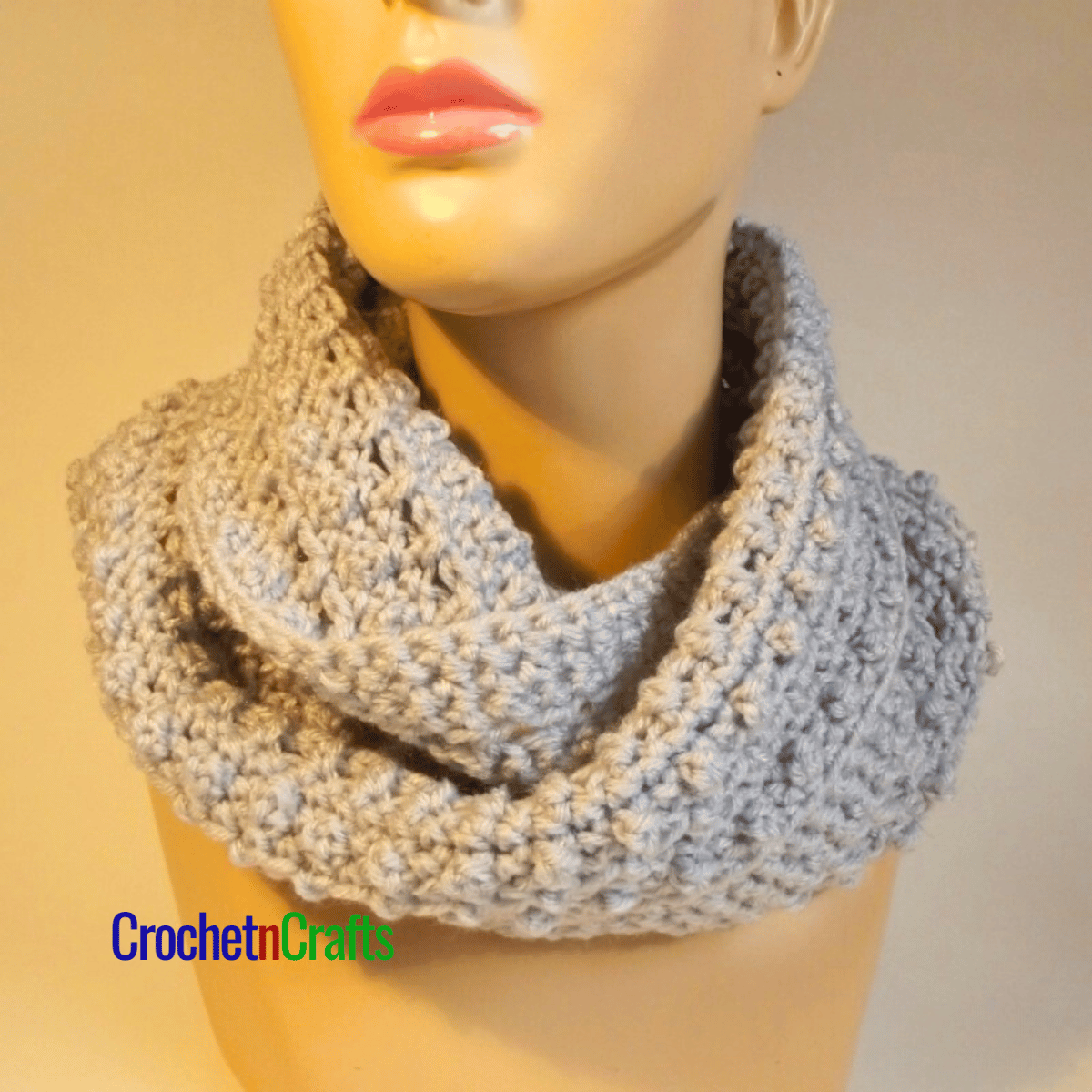 This cozy and elegant cowl is worked on both sides like an infinity cowl. Thus, it’s got both the right and wrong sides showing up on the same side. It looks great to have both sides showing. However, I crocheted mine nice and tall so you can fold it over so only the right side shows.