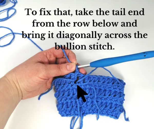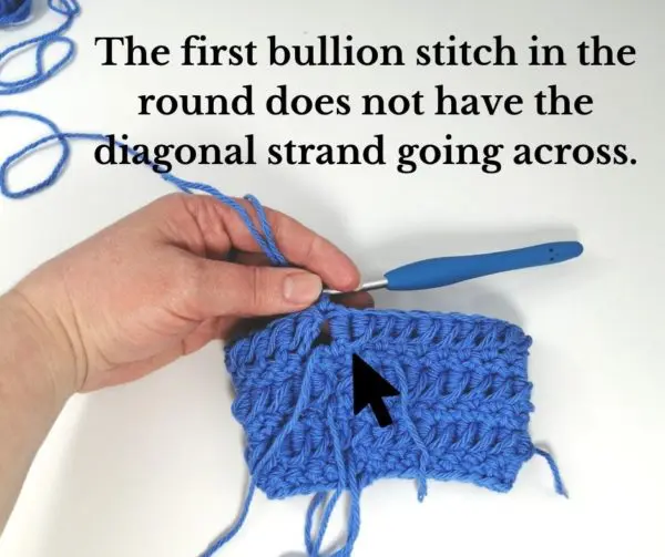 - This pattern is fastened off prior to each round with the bullion stitches. This way you can start the bullion stitch rounds with a standing stitch for a cleaner seam. See photos below on how to carry tail end the yarn up across the first bullion stitch to maintain the same texture throughout.