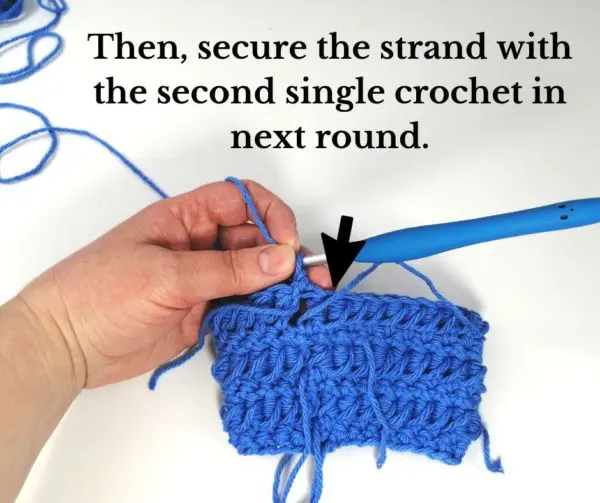 - Then secure the strand by crocheting over it starting with the second single crochet of next round.