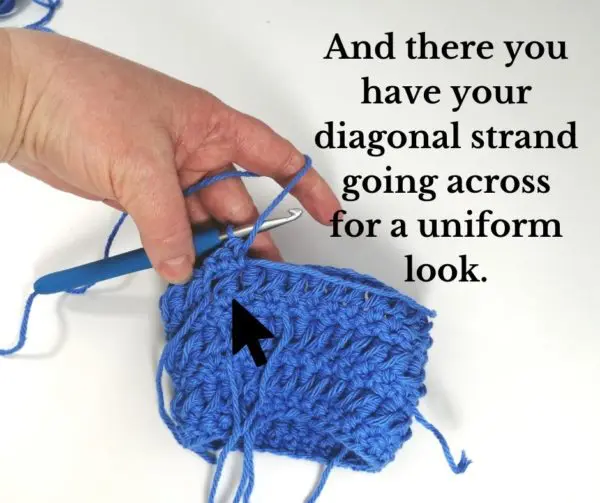 - To fix this, simply take your tail end from where you fastened off at the previous row and bring it up across as shown.