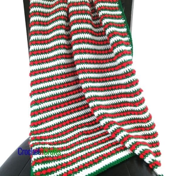 Although it’s crocheted up in Christmas colors for a decorative Christmas afghan, you can choose any of your favorite colors to make this crochet blanket for any season. I chose three colors, but I can also see this done up in two colors where you only change colors to do the bobble rows. Another option would be a solid white throughout.