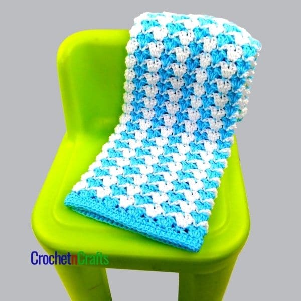 The baby blanket pattern only measures 20 inches square, but it can be adjusted to any size you need in a multiple of 6 plus 2. And you can also use any yarn and hook size suitable for the yarn. Use this blanket size chart as a reference.