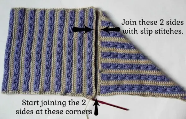 - Fold the fabric as pictured below (ill 6), so that right sides are facing each other and the WS is facing outward. Starting at the center st at the corners begin to join the two sides with sl sts (ill 6). When you hold the fabric up you will catch the bl only on both fabric strips (ill 7). This way you get a ridge on both sides of the fabric and it aligns with the rest of the pattern.