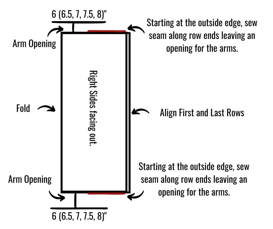 - Fold the rectangle in half with the right side facing out. With the mattress stitch, sew the seam along each side leaving a 6, (6.5, 7, 7.5, 8)" opening for each arm.