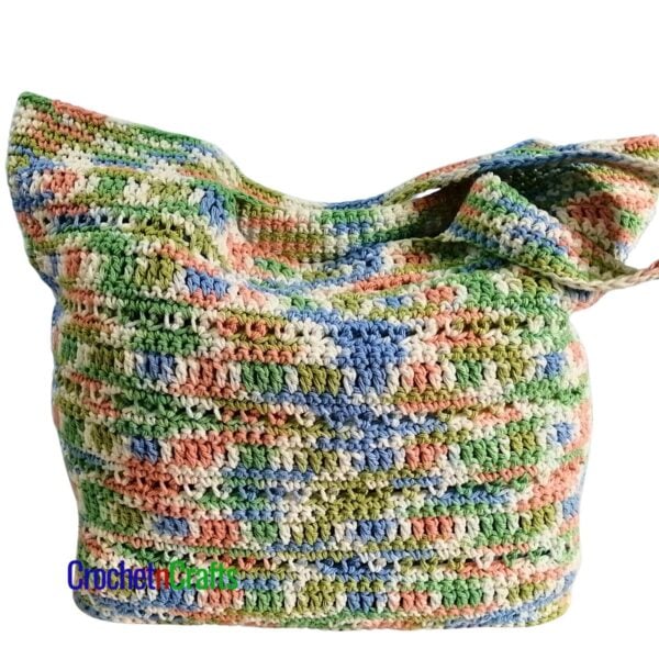 This crochet bag pattern starts at the bottom and is worked to the top in one piece, including the handles.