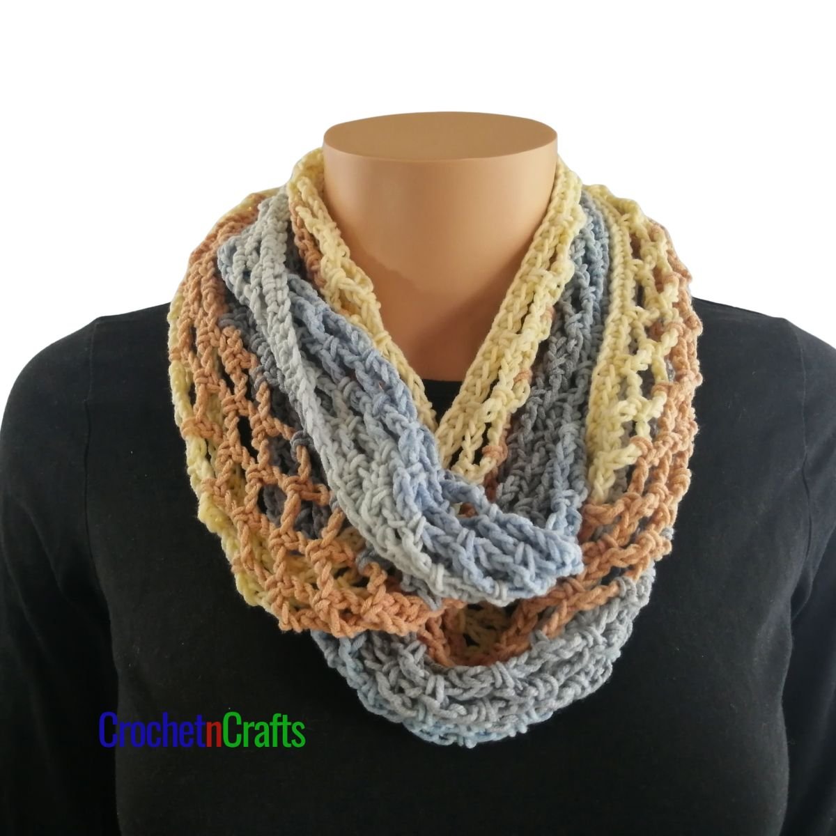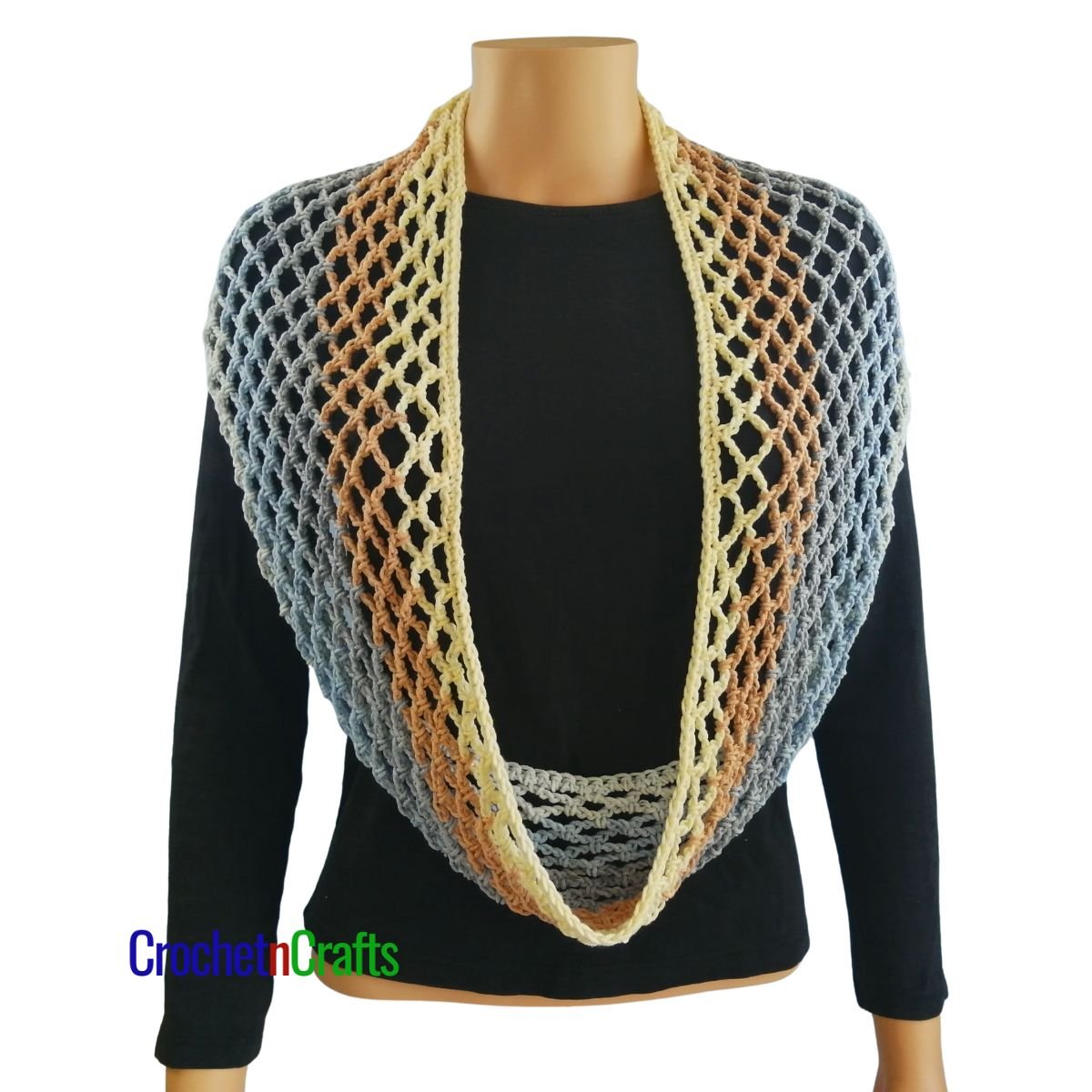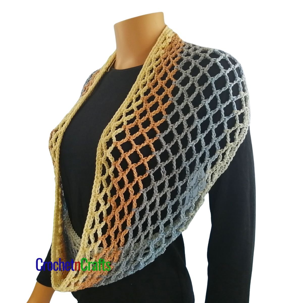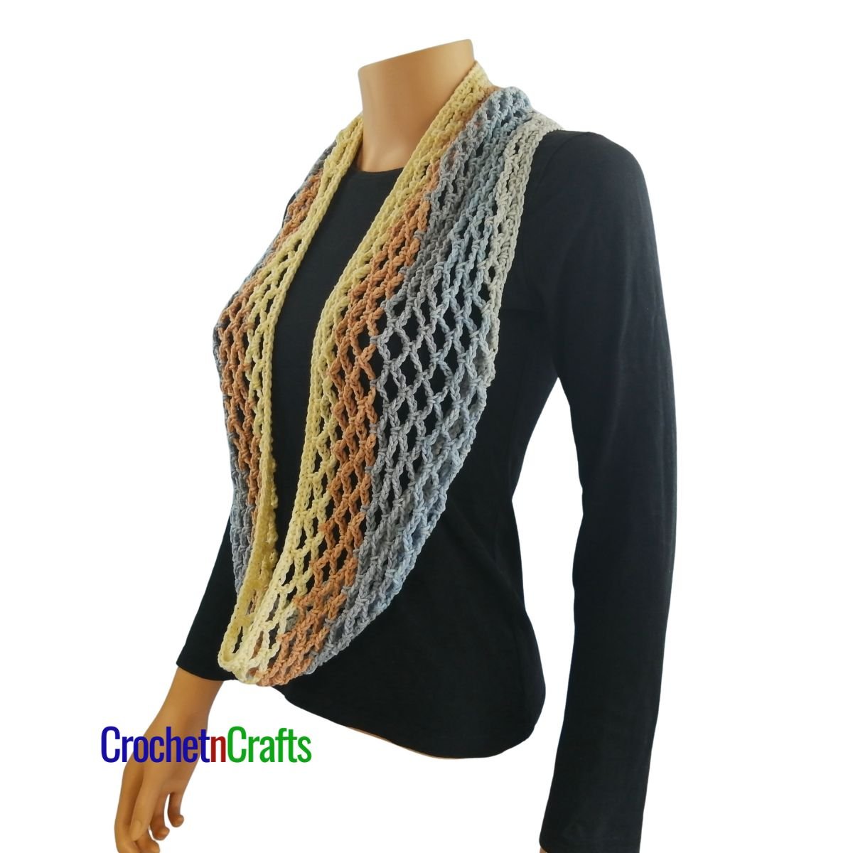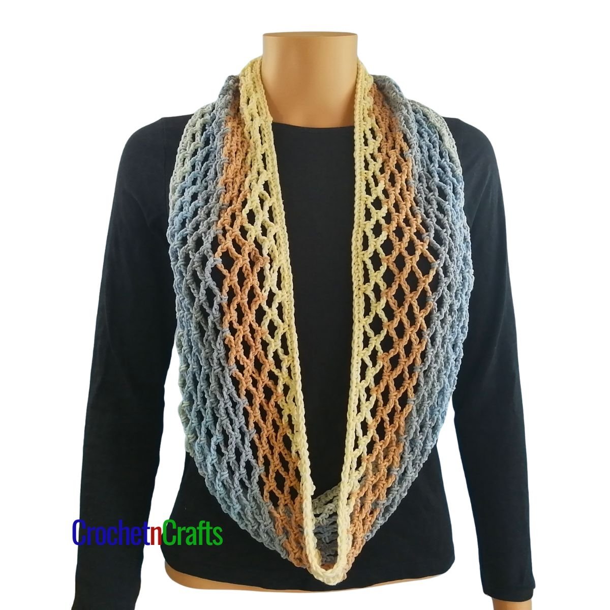 Transition into the cooler autumn days in style with this lightweight crochet diamond mesh cowl. The open diamond stitch pattern makes it the perfect piece for layering over any long-sleeved shirt or underneath a fall jacket.