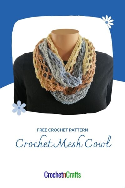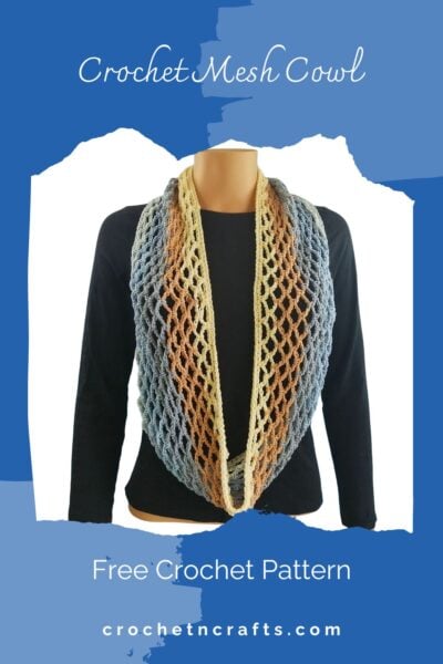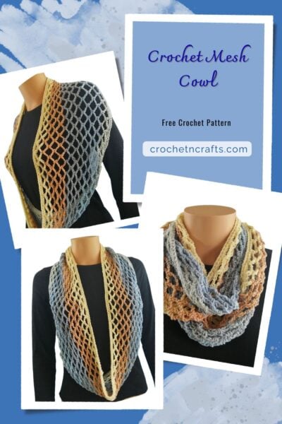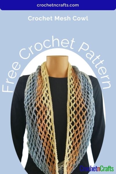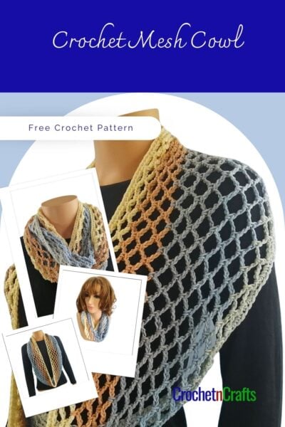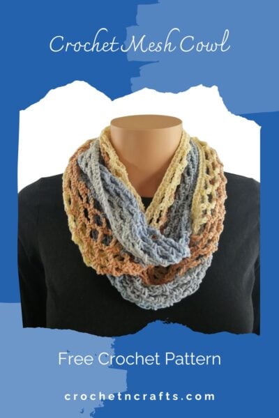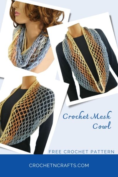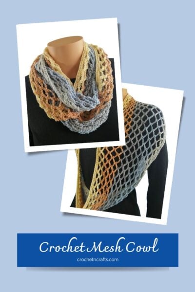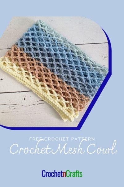 This crochet mesh cowl is worked in a 5-chain diamond mesh stitch. For a 3-chain mesh and a pretty picot edge, you might also enjoy this crochet mesh cowl. For those who prefer this stitch in a scarf might enjoy this crochet scarf pattern.
