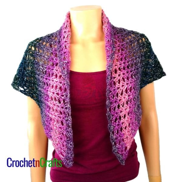 This v-shaped shawl crochet pattern has a long point, which makes it ideal for tying around the neck as a cozy scarf that hangs down at the front. It’s perfect for wearing underneath a light jacket that is open or slightly open.