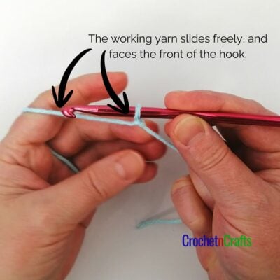 And regardless of whether you are right or left-handed, the working yarn that freely slides should always be facing you when you start your crochet project. In other words, it should come around from the back of the hook and down on the front side of the hook. (This is also true when you’re in the middle of your crochet project, and you happen to drop your hook from the active loop. When you go to re-insert your hook, the sliding part of the loop with the working yarn is always facing you.)