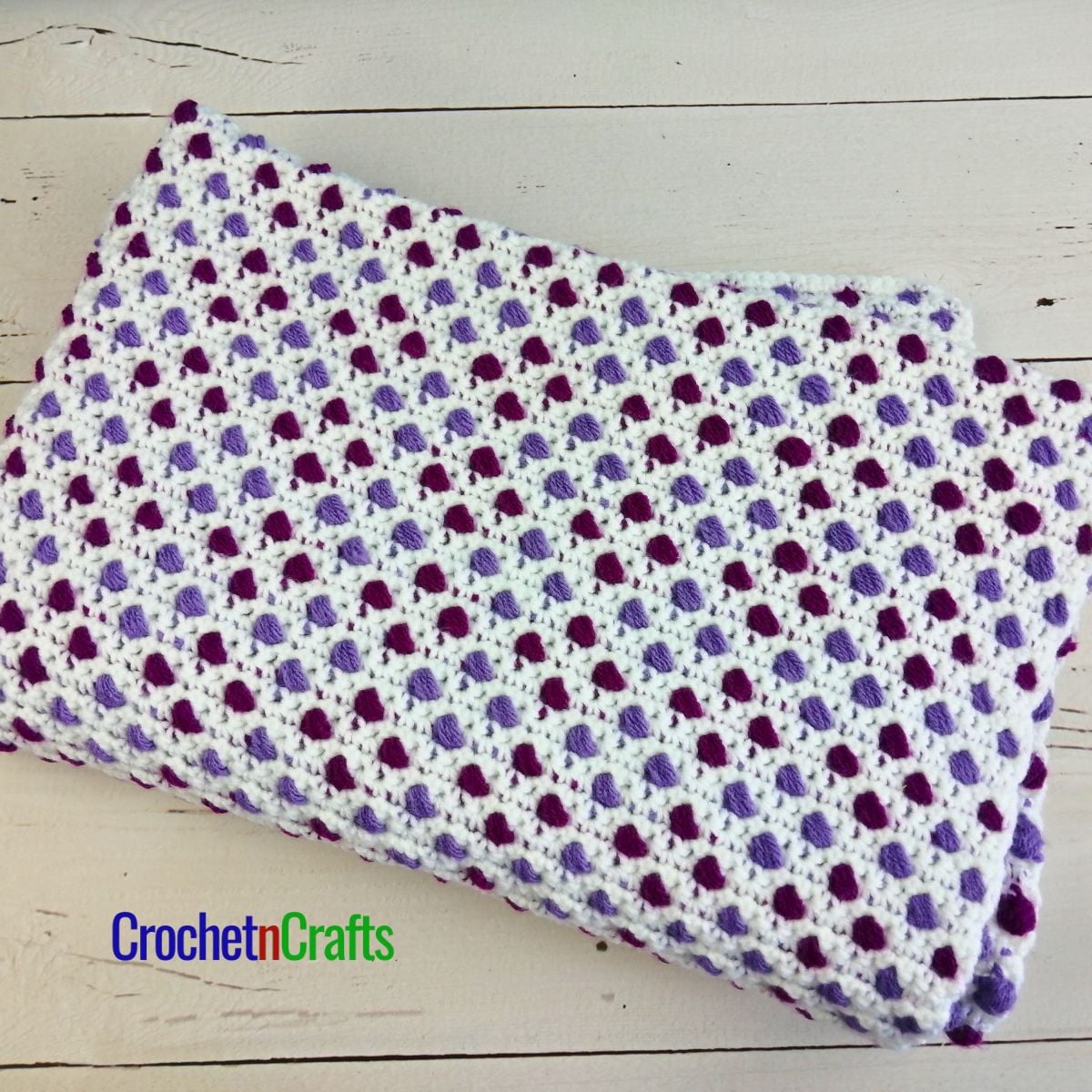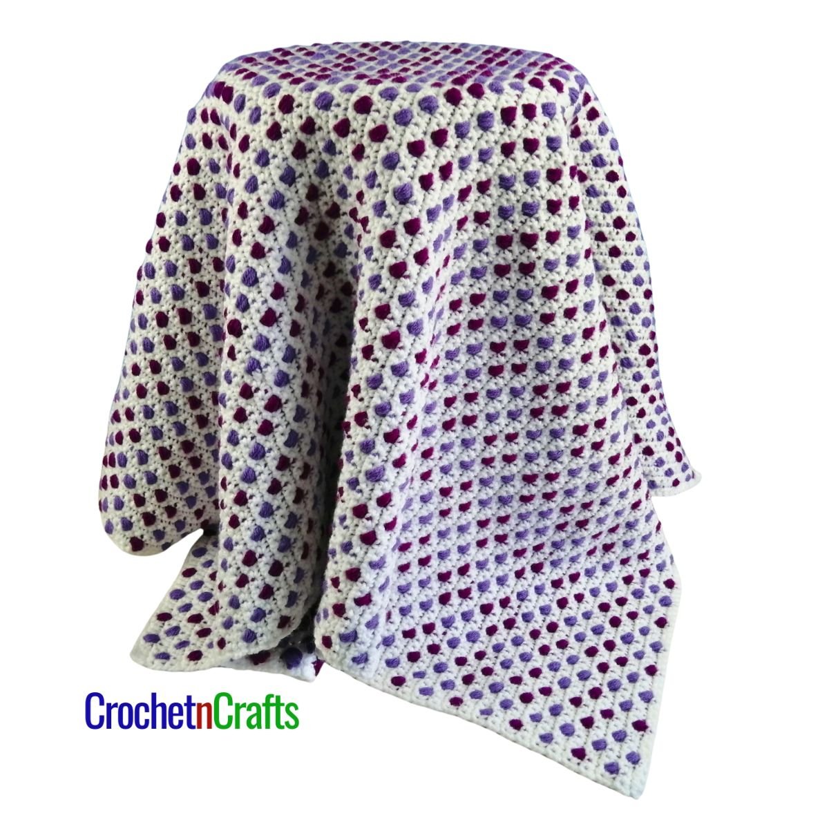 The puffy texture on this crochet lapghan makes it the perfect blanket for playing on the floor or for snuggling on the couch.