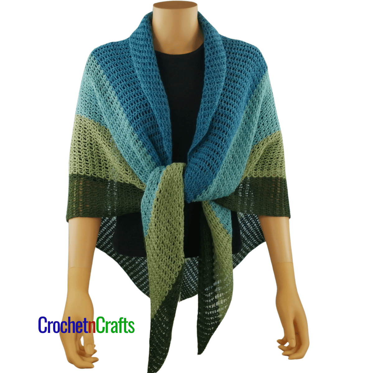 This lightweight, triangular crochet shawl pattern is easy and mindless to crochet. It is the perfect accessory for year-round use. regardless of the occasion.